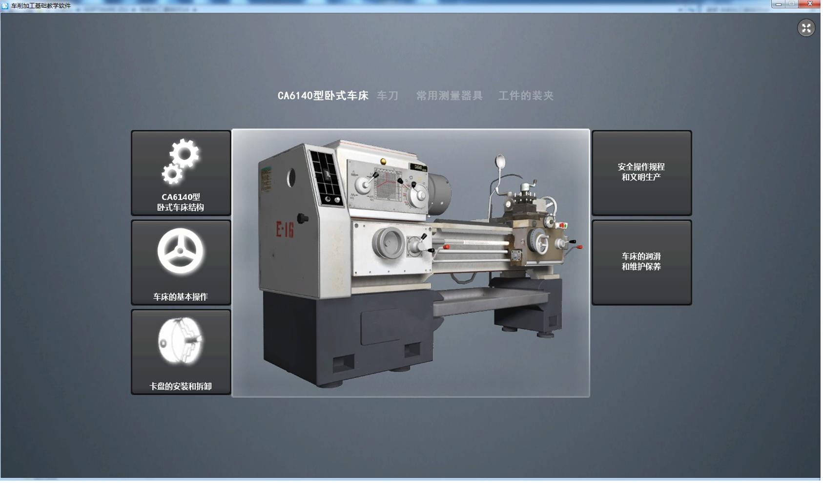 车削基础教学软件由CA6140车床、车刀、常用测量工具、工件的装夹四大模块组成。