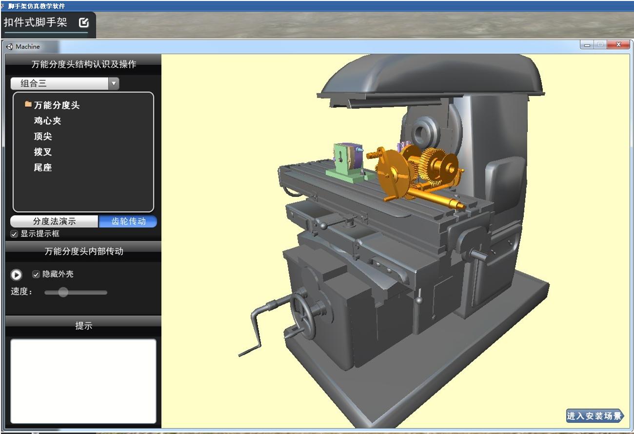 该系统不仅提供了外部结构及内部传动系统介绍等功能,而且支持学生进行自主学习,利用该软件进行分度法演示,练习实际的操作样例,使学生轻松的掌握万能分度头使用方法。