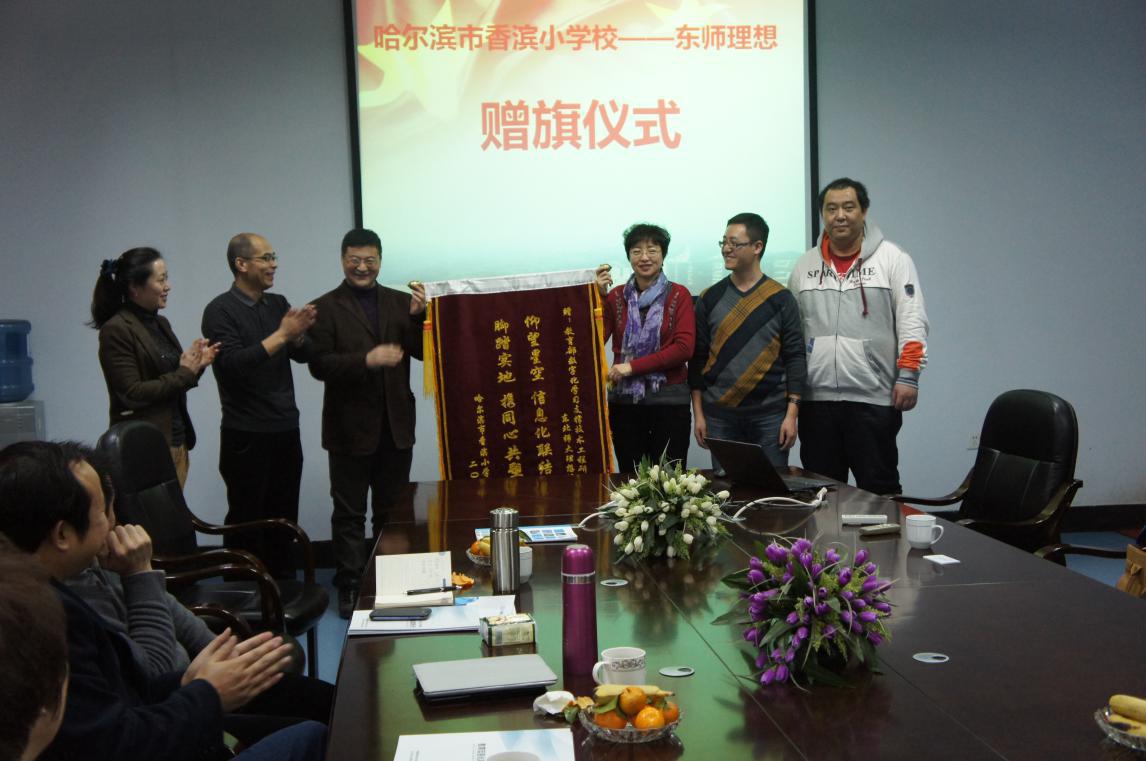 2014年1月13日,哈尔滨市香滨小学校长孙唯一行三人怀着满腔热情来到东师理想信息技术研究院,并赠与一面锦旗,借此表达对教育部数字化学习支撑技术工程研究中心(以下简称“工程研究中心”)和东北师大理想信息技术研究院(以下简称“研究院”)的感激之情。