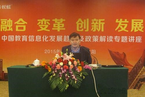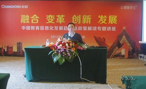 随后,北京师范大学黄荣怀教授则解读了中国教育发展愿景——智慧教育。黄教授认为一个真正的多媒体教室应该必备五个因素:网络空间、基于教师交互的交互式白板、及时反馈系统、基于学生的学习终端和学习应用环境;华南师范大学柯清超教授通过国际化经典案例和趣味性视频,结合自己的学术研讨,阐述了互联网思维下的信息化课程发展;东北师范大学钟绍春教授表示:“教育信息化要发自学生内心主动性、个性化、轻松愉快的学习,在学习过程中能智慧化创新,这才是学生学习的东西,其次实现信息技术与教育深度融合,促进教育公平。”在演讲的最后,钟教授说:“开展有魂的教育信息化,这是像长虹这样的大型企业实现的目标。”