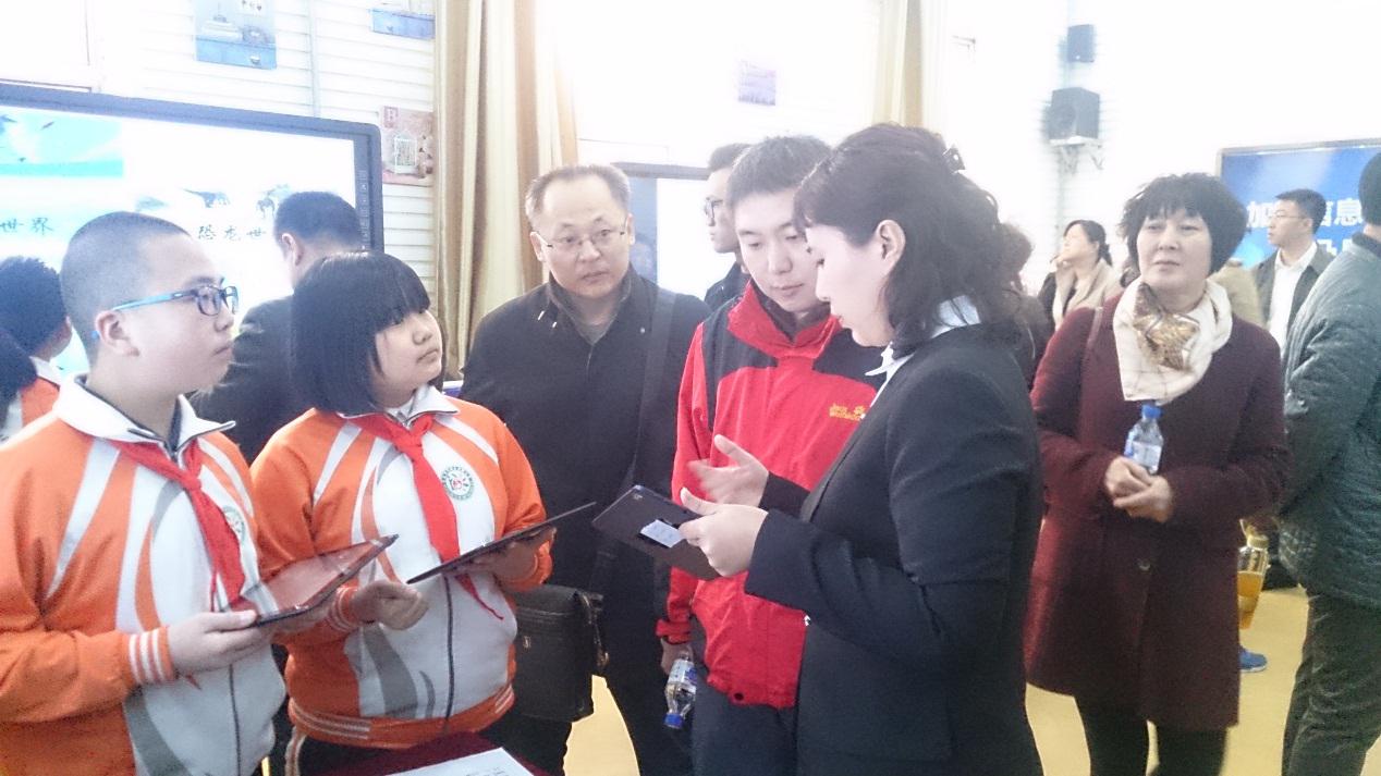 在展会的另一端——智慧课堂教学展区,宽城实验小学姜黎黎老师和她的学生们一起为前来展区参观的领导们演示电子书包。