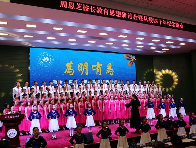 2016年4月21日,由武汉市东西湖教育局、华中师范大学学校文化研究中心、湖北省普通教育干部培训中心、湖北省民办中小学幼儿园协会、武汉市民办中小学幼儿园协会、为明教育集团共同举办的“周恩芝教育思想研讨会暨从教四十年纪念活动”在武汉为明实验学校隆重举行。中国教育学会、教育部数字化学习支撑技术工程研究中心、华中师范大学及省、市、区各级单位的领导、专家和嘉宾共计500余人,云集北大附中武汉为明实验学校,深入研讨周恩芝校长的教育思想,全面梳理周恩芝校长“新全人教育思想”的教育成果。钟绍春教授应邀参加并作专题讲座。