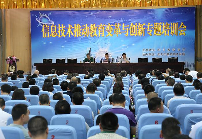 6月22日,由四川省教厅主办,南充市教育和体育局协办的信息技术推动教育变革与创新专题培训会在南充一中举行。四川省教育厅信息化推进办公室主任李兆鸿主持会议,南充市教育和体育局副局长胡良华致欢迎辞。来自各县(市、区)教体局分管局长、管理教育信息化和教学业务的职能股室负责人、部分中小学校长450余人参加了此次专题培训。